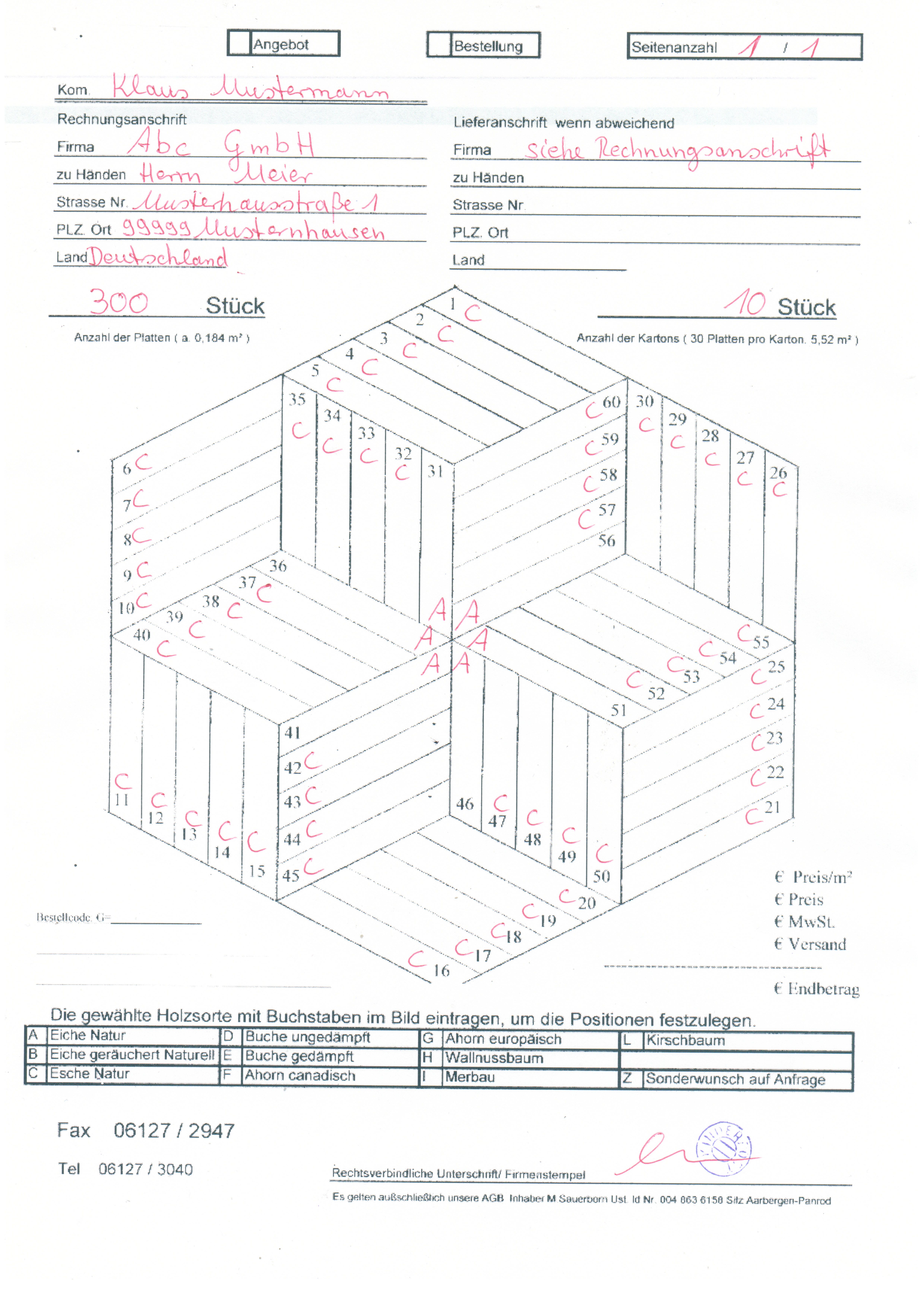Soll ein Angebot oder eine Bestellung mit einer Holzart und Farbe durchgeführt werden, so reicht 1 Blatt aus. Werden im normalen Boden Muster ( z.B. Sterne ) eingelegt, so werden die Muster separat bearbeitet und in der Bestellung eingefügt. 1 Blatt für Standard Boden und 1 Blatt für Muster.